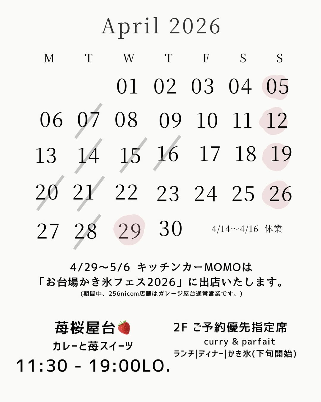 4/18(土)苺桜屋台🍓11:30-19:00|かき氷 カレーセット12:00〜.単品13:00 Check!! >>